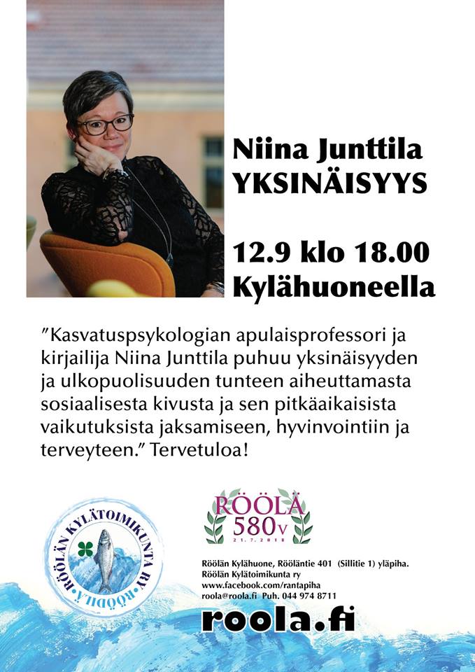 Kasvatuspsykologian professori ja kirjailija, yliopistotutkija Niina Junttila on tutkinut laajalti yksinäisyyttä josta hän tulee kertomaan.Kansainvälisten tutkimusten mukaan yksinäisyys heikentää immuunipuolustusjärjestelmää, lisää sydän- ja verisuonisairauksien riskiä ja muuttaa aivojen hormoni- ja stressinsäätelymekanismeja. Niina Junttila