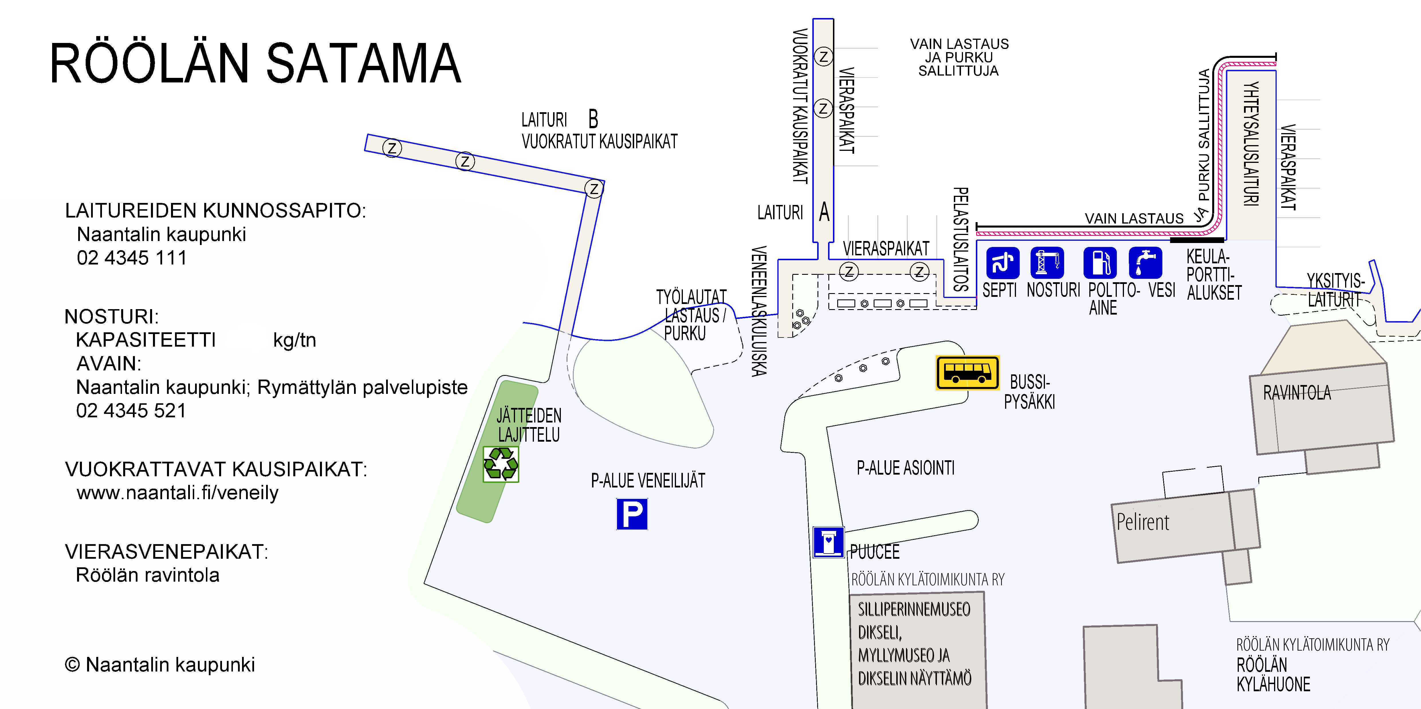 Röölässä on vieraslaituripaikkoja. Paikat ovat pääsääntöisesti poijupaikkoja, myös muutamia kylkipaikkoja löytyy isommallekin veneelle. Ponttoonilaiturilla on sähköt. Satamamaksu on 15e / yö sähköllä -kysy Ravintola Röölänranta. Veneilijöille päivävisiitit ilmaisia. Ponttoonilaitureilta löytyy kaupungin vuokrapaikkoja.